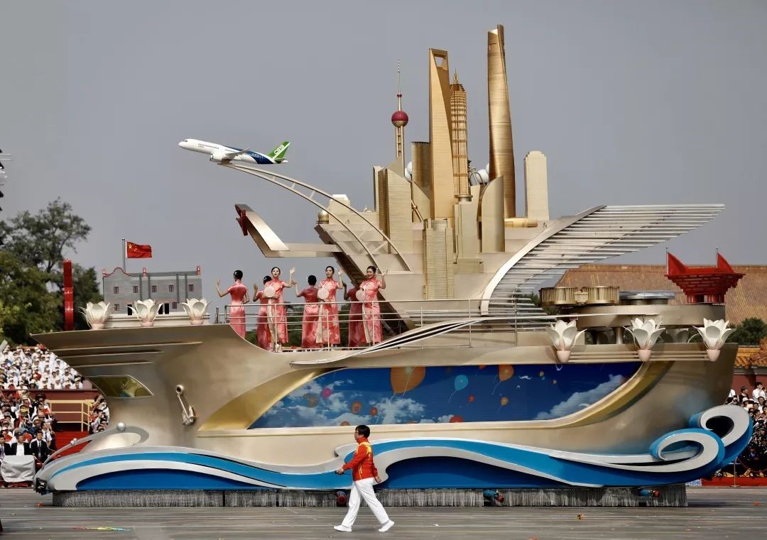 上海彩车犹如一艘破浪前行的希望航船,船首正中红色大字“上海”引人注目,彩车上7位温婉佳人,她们身着海派旗袍、面带微笑、手执团扇,代表上海为祖国母亲献礼!