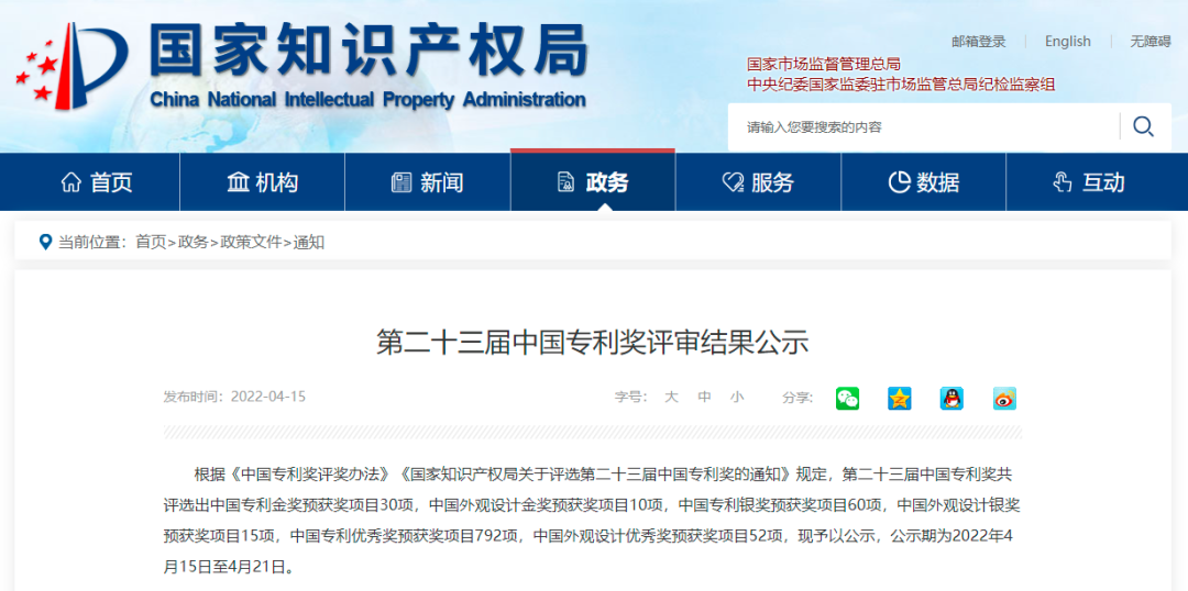 中国专利奖是我国唯一的专门对授予专利权的发明创造给予奖励的政府部门奖,也是我国知识产权领域的最高级别荣誉,得到联合国世界知识产权组织的认可,极具公信力、代表性与影响力。