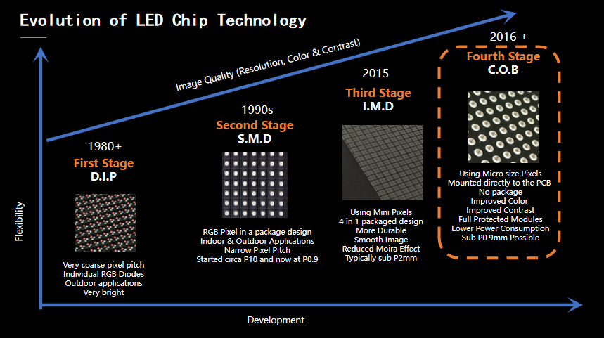 随着上游材料的规模化生产和技术普及,微间距LED显示屏市场规模实现量级增长。倒装COB作为实现微间距显示的主要技术路径,已成为全球LED显示企业共识和争相布局的重点领域。技术更迭加速市场需求演变,未来户内显示或将全面COB化。