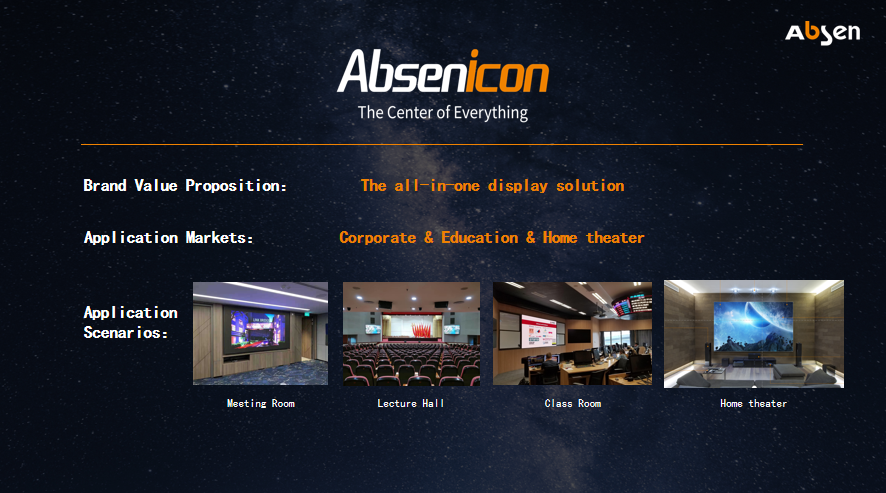 早在2018年6月,leyu体育官网就推出iCon高端会议显示解决方案,发展至今成为Absenicon品牌。Absenicon是针对传统LED工程屏安装维护复杂、智能交互及生态软件功能缺失等问题开发的100吋以上的智慧大屏,专注于会议、教育、类消费市场,致力于成为数字经济时代标配的生产生活工具。本次发布的Absenicon X系列、Absenicon C系列宽屏产品进一步完善了Absenicon的产品布局。其中,Absenicon X系列采用倒装COB封装技术,在产品外观、画质、功能、系统等方面实现了极大的跃升。