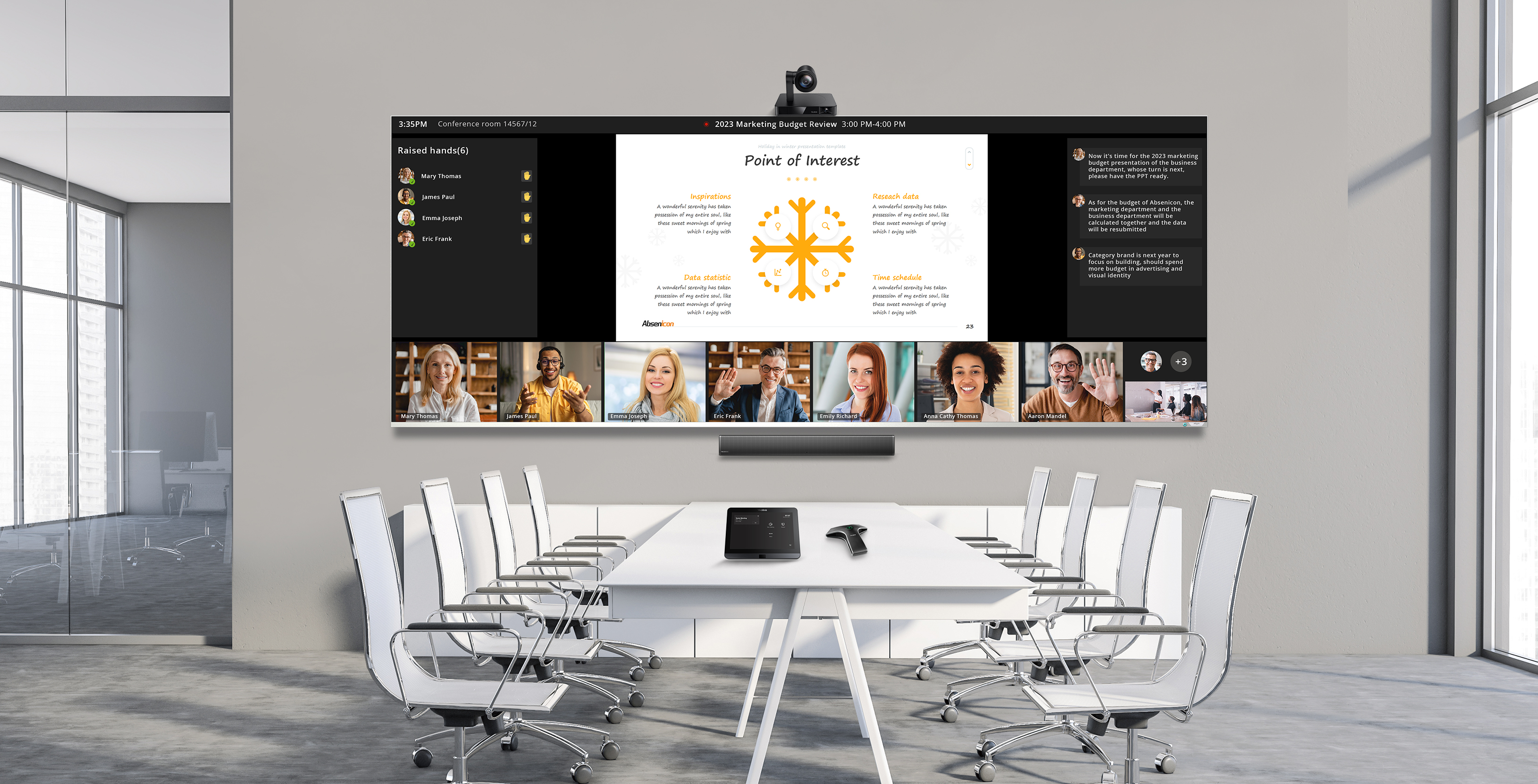 leyu体育官网LED智慧屏Absenicon与亿联网络的UCC解决方案系列相结合,面向以视讯为主的大中型高端会议室,提供音视频演示的沉浸式体验。用户可在多任务需求情景下,灵活定制、拼接视频窗口,实现更高效、更便捷的协作办公。