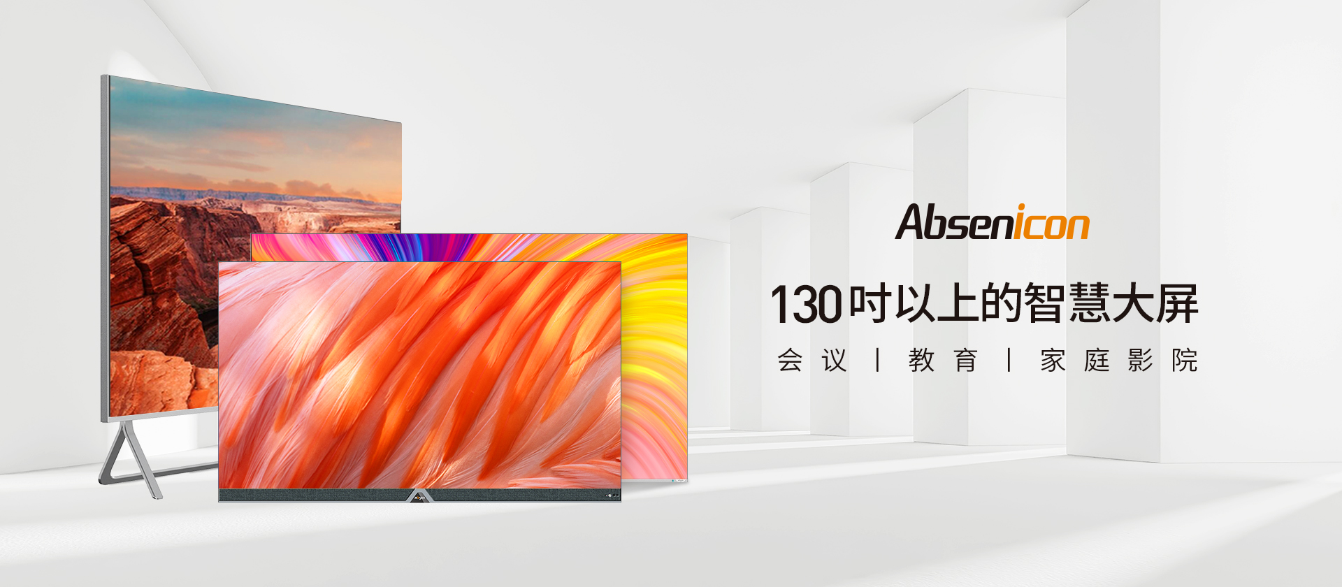 Absenicon定位于130吋以上的智慧大屏,专注于会议、教育、家庭影院等场景。全系列产品采用高度集成设计,安装维护简易便捷,开机即用;内置操作系统,软件兼容性强,可实现遥控控制及无线投屏等功能,操作界面简单,为用户带来极致的交互体验。