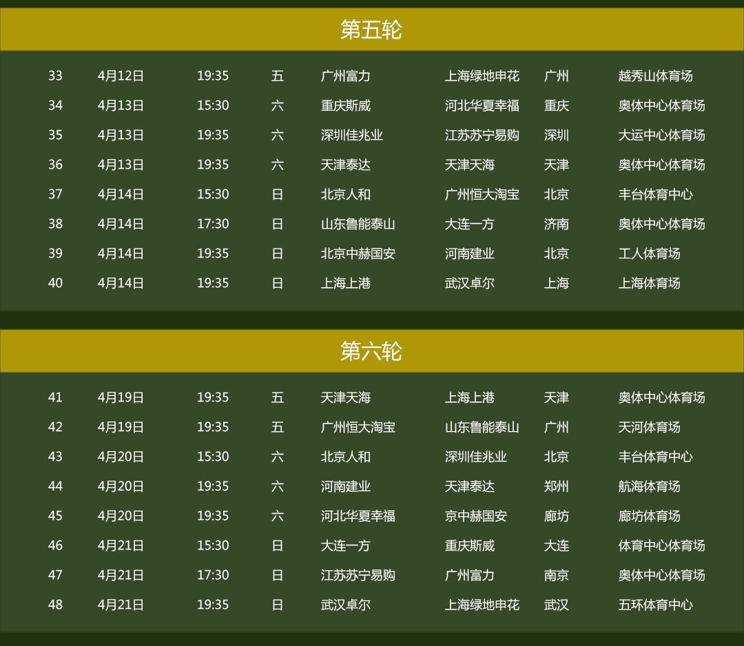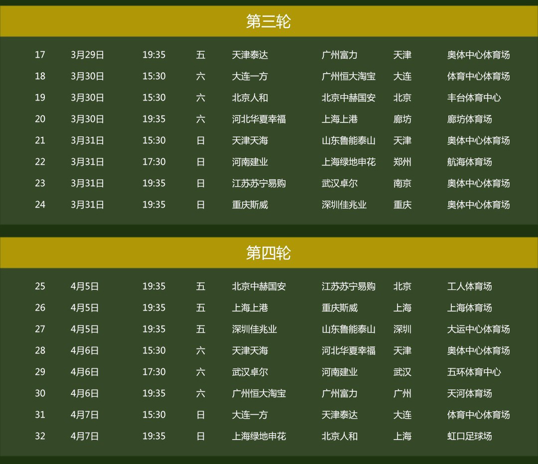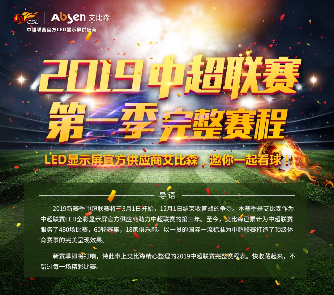 3月1日,2019中超战火重燃,上港失去最佳射手武磊能否卫冕冠军,注入新鲜血液的恒大能否重夺冠军,深足重返中超会有怎样的表现等令人无比关注。作为中超联赛2017-2021年官方LED显示屏供应商,leyu体育官网奉上第一季(3月1日-4月28日)详尽赛程表,赶紧收藏起来,精彩赛事不容错过!