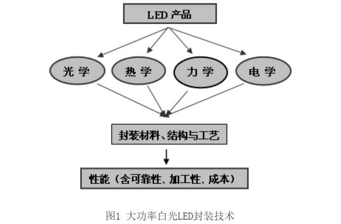 LED封装是一个涉及到多学科(如光学、热学、机械、电学、力学、材料、半导体等)的研究课题。从某种角度而言,LED封装不仅是一门制造技术(Technology),而且也是一门基础科学(Science),良好的封装需要对热学、光学、材料和工艺力学等物理本质的理解和应用。LED封装设计应与芯片设计同时进行,并且需要对光、热、电、结构等性能统一考虑。在封装过程中,虽然材料(散热基板、荧光粉、灌封胶)选择很重要,但封装结构(如热学界面、光学界面)对LED光效和可靠性影响也很大,大功率白光LED封装必须采用新材料,新工艺,新思路。对于LED灯具而言,更是需要将光源、散热、供电和灯具等集成考虑。