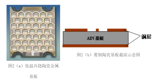 LED封装热阻主要包括材料(散热基板和热沉结构)内部热阻和界面热阻。散热基板的作用就是吸收芯片产生的热量,并传导到热沉上,实现与外界的热交换。常用的散热基板材料包括硅、金属(如铝,铜)、陶瓷(如Al2O3,AlN,SiC)和复合材料等。如Nichia公司的第三代LED采用CuW做衬底,将1mm芯片倒装在CuW衬底上,降低了封装热阻,提高了发光功率和效率;Lamina Ceramics公司则研制了低温共烧陶瓷金属基板,如图2(a),并开发了相应的LED封装技术。该技术首先制备出适于共晶焊的大功率LED芯片和相应的陶瓷基板,然后将LED芯片与基板直接焊接在一起。由于该基板上集成了共晶焊层、静电保护电路、驱动电路及控制补偿电路,不仅结构简单,而且由于材料热导率高,热界面少,大大提高了散热性能,为大功率LED阵列封装提出了解决方案。德国Curmilk公司研制的高导热性覆铜陶瓷板,由陶瓷基板(AlN或Al2O3)和导电层(Cu)在高温高压下烧结而成,没有使用黏结剂,因此导热性能好、强度高、绝缘性强,如图2(b)所示。其中氮化铝(AlN)的热导率为160W/mk,热膨胀系数为4.0×10-6/℃(与硅的热膨胀系数3.2×10-6/℃相当),从而降低了封装热应力。