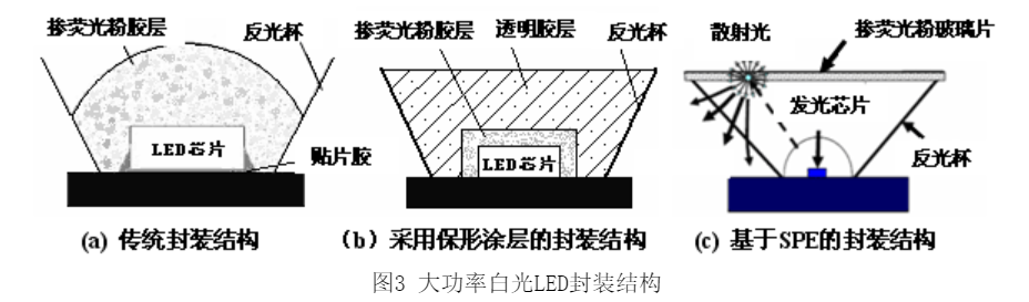 传统的荧光粉涂敷方式是将荧光粉与灌封胶混合,然后点涂在芯片上。由于无法对荧光粉的涂敷厚度和形状进行精确控制,导致出射光色彩不一致,出现偏蓝光或者偏黄光。而Lumileds公司开发的保形涂层(Conformal coating)技术可实现荧光粉的均匀涂覆,保障了光色的均匀性,如图3(b)。但研究表明,当荧光粉直接涂覆在芯片表面时,由于光散射的存在,出光效率较低。有鉴于此,美国Rensselaer 研究所提出了一种光子散射萃取工艺(Scattered Photon Extraction method,SPE),通过在芯片表面布置一个聚焦透镜,并将含荧光粉的玻璃片置于距芯片一定位置,不仅提高了器件可靠性,而且大大提高了光效(60%),如图3(c)。