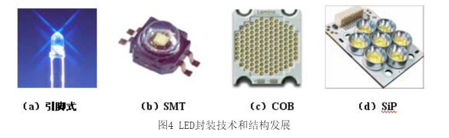经过40多年的发展,LED封装技术和结构先后经历了四个阶段,如图4所示。