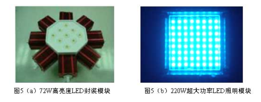 在系统集成方面,台湾新强光电公司采用系统封装技术(SiP), 并通过翅片+热管的方式搭配高效能散热模块,研制出了72W、80W的高亮度白光LED光源,如图5(a)。由于封装热阻较低(4.38℃/W),当环境温度为25℃时,LED结温控制在60℃以下,从而确保了LED的使用寿命和良好的发光性能。而华中科技大学则采用COB封装和微喷主动散热技术,封装出了220W和1500W的超大功率LED白光光源,如图5(b)。